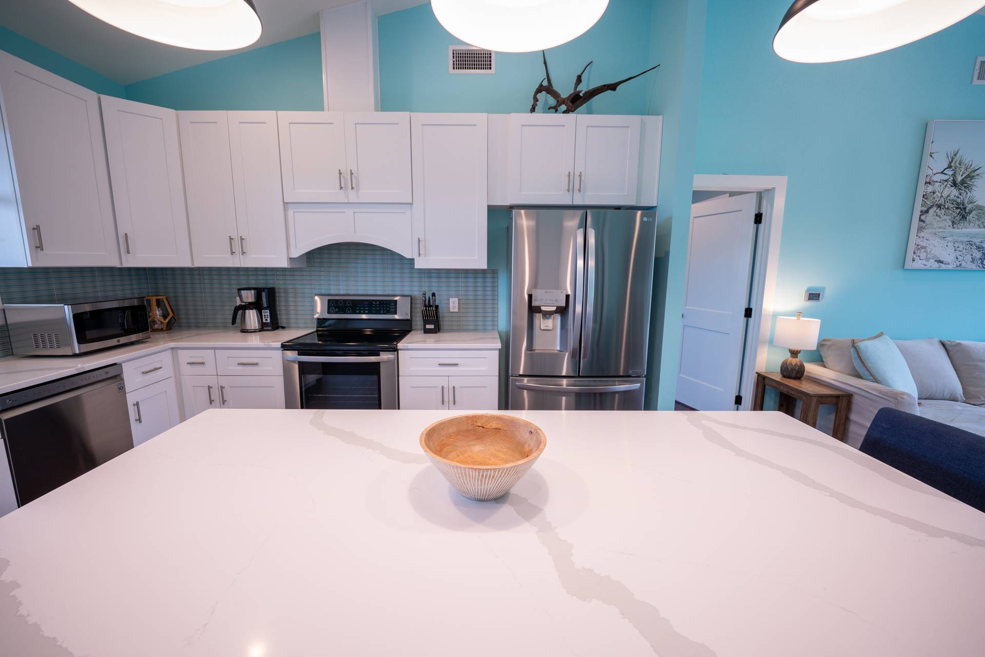 Escape to the perfect coastal retreat, where relaxation meets adventure. This stunning vacation home offers the ultimate blend of comfort, convenience and fun! Unwind in the spacious living room, equipped with a 65” TV and a sizeable sofa, perfect for lounging. Whip up a tasty meal in the well-equipped kitchen with both a 12 cup drip coffee maker and single cup Keurig, complete with stainless steel appliances and large food pantry. Gather around the dining bar for a feast with family and friends or eat outdoors on the gated, covered deck overlooking the spacious backyard with a peek-a-view of the Gulf of Mexico! A full-size washer/dryer is located just past the kitchen.